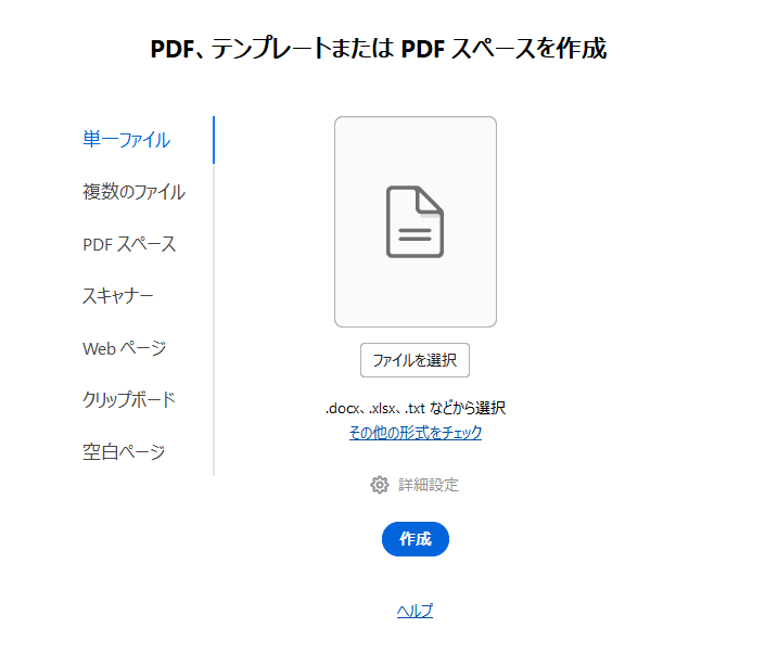 新規文書が立ち上がり、何からPDFを作るか選択する画面となります。