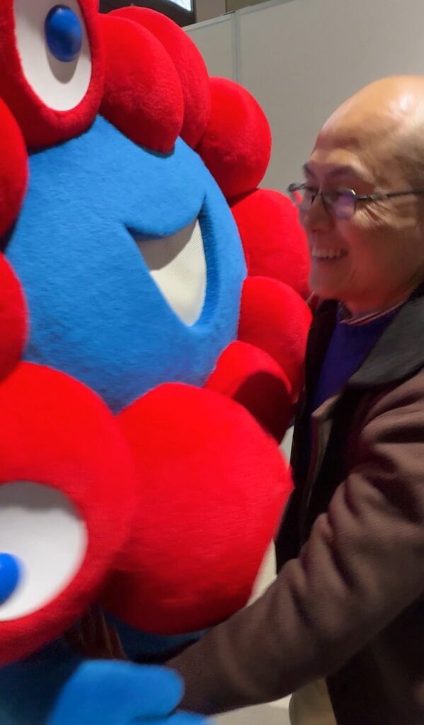 大阪万博マスコットキャラクターのミャクミャクが広島駅にやってきました。